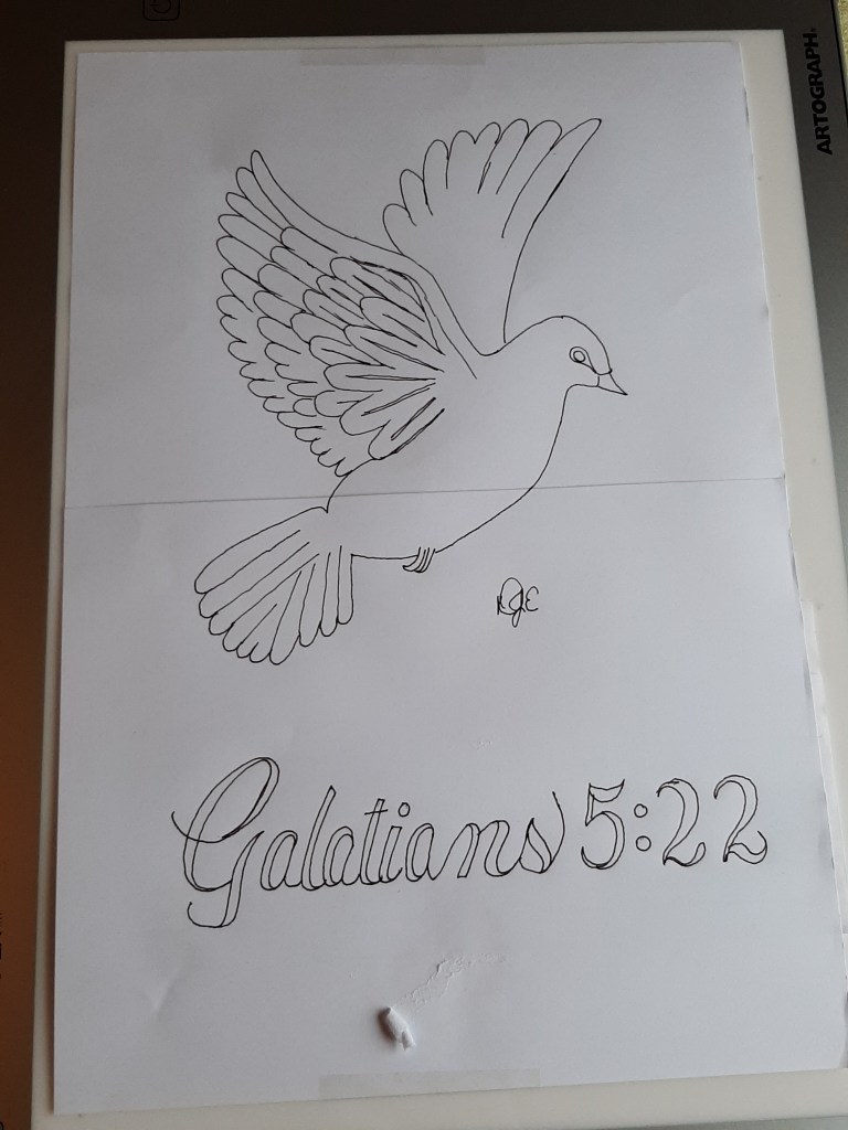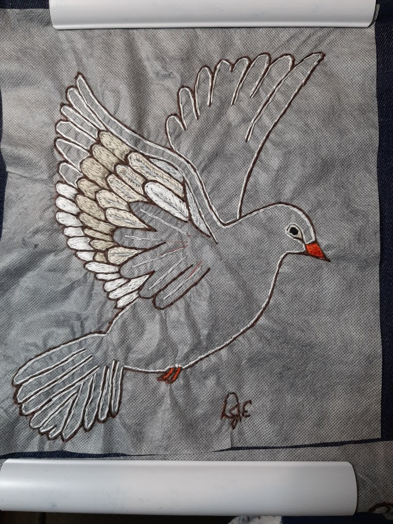 At first, I thought the dove would be too hard, because it is white. But my sister encouraged me to give “the customer what they want”. Mom sent me a card that helped me get the look I was looking for. Then, the trial-and-error process began related to the dove. Finally, the dove emerged. The scripture presented its own challenge. But with the help of a seamstress master, it all came together. Don’t you think?